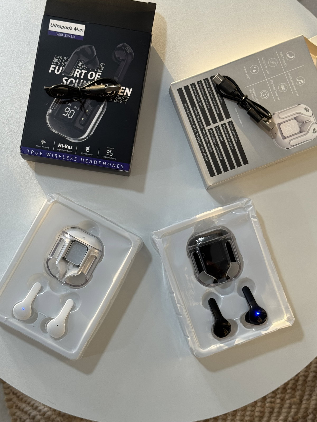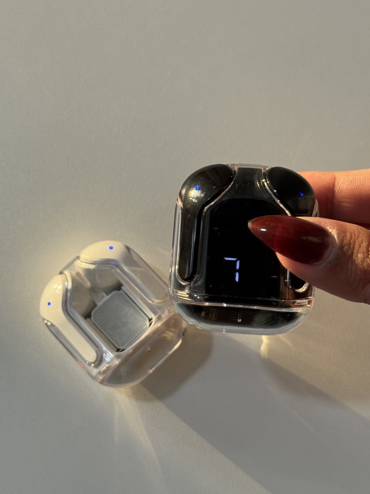 Estuche de carga transparente.Indicación digital del porcentaje de batería.Duración de la batería: de 4 a 6 horas.Distancia de detección: 10-15 metros.Modo dual: modo juego/modo música.Auricular engomado.